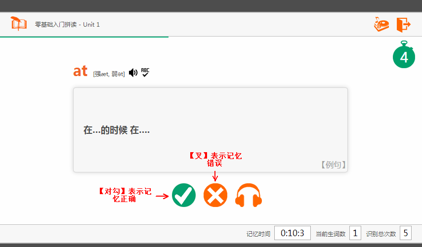 在做智能记忆时 系统会给出一个单词和读音,请在5秒钟倒计时时限内 快节奏大声跟读2遍单词,不停顿直接说出词义。