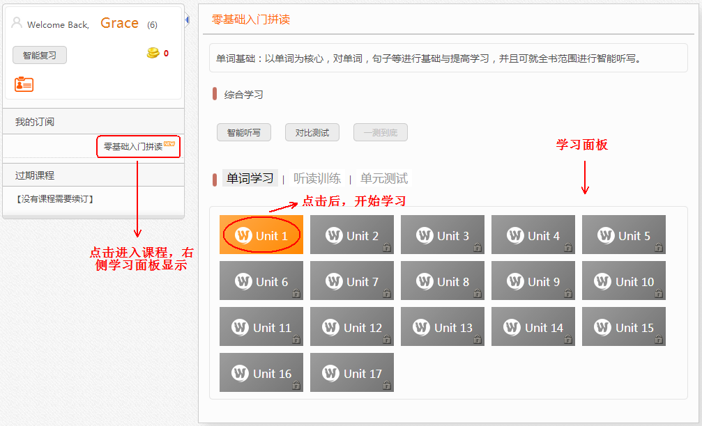 如上图点击Unit 1后,学习窗口将打开,点击“开始学习”就可以开始学习了。学习过程中,窗体如图所示: